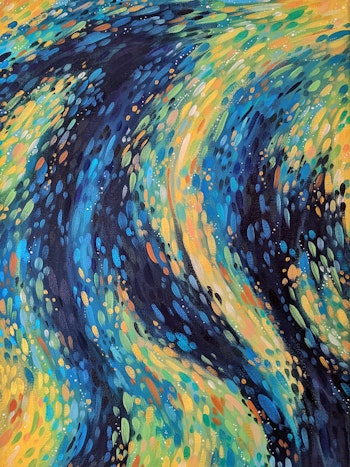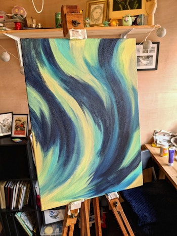I really like how this one came out. Plenty of blues and greens here, but it still feels quite warm? It's also hard to capture on my phone, but I used iridescent and metallic paints so it shimmers when you walk past it. ✨