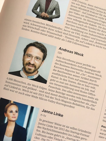 I am always very happy when my work for t3n magazine is valued. This happens more and more often in the context of LinkedIn. In this edition of the turi2 media magazine, the editors honored me for good journalism work on this network - not just me, but also the talented Carina Kontio from Handelsblatt and Janna Linke from N-TV.