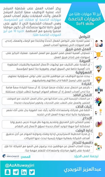 أهم 10 #مهارات_ناعمة مطلوبة بسوق العمل ويبحث عنها مسؤولي #التوظيف. هذي أول مادة أترجمها بمجالي بالتعاون مع المبدعة Lama Aljuraid لمى الجريّد. لو الفكرة مناسبة نستمر فيها بإذن الله😊