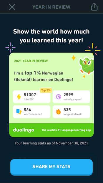 I am happy to share that in 2021, I am in the top 1% of Norwegian (Bokmål) learners according to Duolingo!!