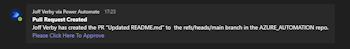With PowerAutomate we now have an automated message from the Bot posting into the chat when a PR is created to the main branch, including some nice dynamic content!