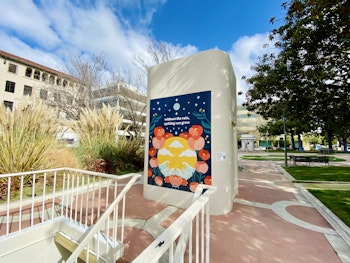 This mural was commissioned by the Palo Alto Public Art Program as part of the city’s UplIft Local initiative to support community well-being and economic recovery. You can visit it at King Plaza in downtown Palo Alto, California for the duration of 2021.
