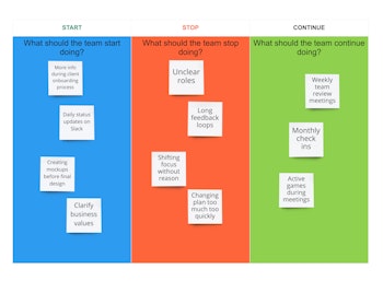 Well, you can use retrospective games like this to narrow down the teams feelings and create some quick, actionable goals. In this exercise, everyone has a change to note down what they think should be added to the workflow, removed, and continued.