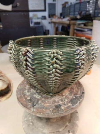 When I leave the keyboard, I am a visual artist. I recently created a 3D ceramic design and printed it on a Potterbot printer in stoneware with Oribe glaze. The bowl shown here is about 8" tall. 3D printing combines the ancient art of pottery making with the very current skill of 3D printing and requires the artist to think in multi dimensions, outside the typical constraints of claywork.