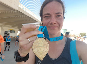 Valencia Marathon 2019 (seems like such a long time ago now) in 3:57:53. Photo taken right after the finish, you can clearly see the exhaustion and determination in my eyes.