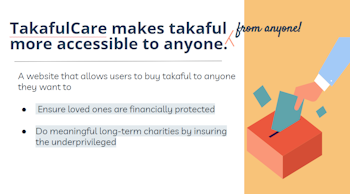 Our team is shortlisted as top 3 teams in Malaysia where we bring our idea to takaful anyone from anyone.