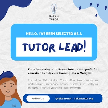 After joining the onboarding session, I can now finally say I am selected to be a Rakan Tutor Team Lead! This role provides me the opportunity to tutor on a student on Mathematics Modern for SPM while being able to lead other tutors in doing their tutoring activities. Excited for what is to come.
