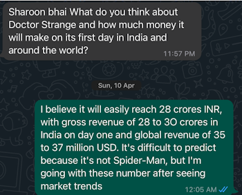 Dr. Strange is hard to Predict. It's weird, People love this Character, but when you look at previous box office numbers, they are reasonable, not out of this world, let's see what happens. All the best to the entire team... I hope it will touch 28-30cr INR and 35-37 Million WW on Day one!!!