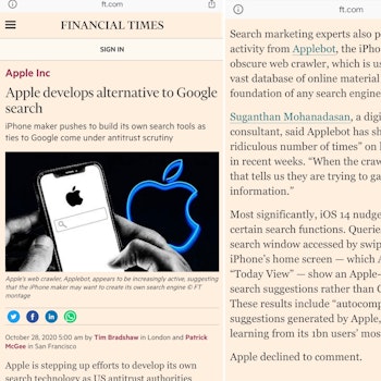 Apple is stepping up efforts to develop its own search technology as US antitrust authorities threaten multibillion-dollar payments that Google makes to secure prime placement of its engine on the iPhone. In a little-noticed change to the latest version of the iPhone operating system, iOS 14, Apple has begun to show its own search results and link directly to websites when users type queries from its home screen. That web search capability marks an important advance in Apple’s in-house development and could form the foundation of a fuller attack on Google, according to several people in the industry. The Silicon Valley company is notoriously secretive about its internal projects, but the move adds to growing evidence that it is working to build a rival to Google’s search engine.