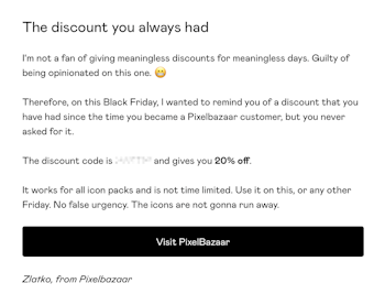 In essence, each subscriber gets a 10% discount, and each customer gets a 20% discount. No false urgency. No crazy undervalued Black Friday deals.